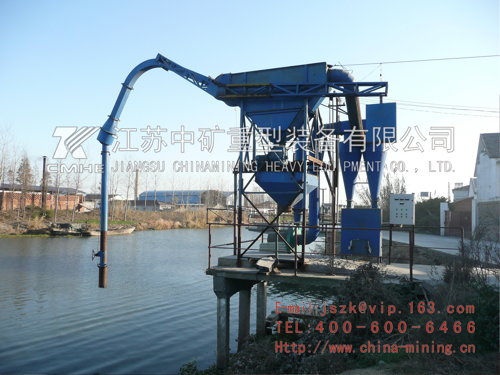由江蘇中礦重型裝備有限公司生產的負壓卸船機采用靈活的液壓折疊多節吸臂,PLC電器控制及線控操作系統穩定可靠,液壓馬達穩定耐用,節能環保,平均能耗為1~2度電/噸,噪聲低。本公司可根據用戶需要,后續輸送是設接雙倉泵管道氣力輸送入庫。抽吸臂長度根據碼頭水位和來的船型尺寸定。固定式負壓卸船機是固定在港口、碼頭或散裝物料存放點。采用單倉泵,雙倉泵或分離壓送泵等將物料正壓輸送進入料庫。可分為后續機械輸送,氣力輸送和直接裝車三種方式。