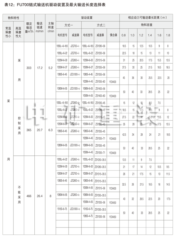 表5: FU150鏈式輸送機驅動裝置及輸送長度選擇表 Table 5: FU150 Chain Conveyor Drives and Max Conveying Distances