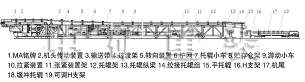 落地側(cè)裝式鋼架為機(jī)身,上托輥組間距為1 2或1 5米,下托輥組間距為3米。托輥組設(shè)有前后調(diào)整位置,通過(guò)調(diào)整托輥組位置來(lái)調(diào)整輸送帶的跑偏。托輥均采用沖壓軸承座托輥,設(shè)有雙重密封,具有重量輕、密封性能好、旋轉(zhuǎn)阻力小、使用壽命長(zhǎng)等特點(diǎn)。